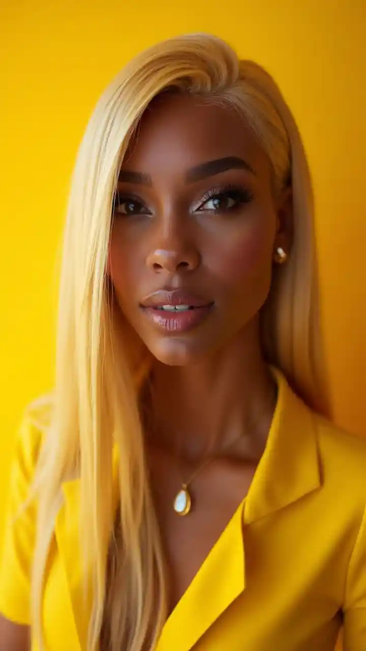 Il y a une image étonnante et charmante, une femme à la peau brune, une beauté noire avec une longue extension, avec des racines blondes droites et des faux cils. Ses lèvres pleines, rehaussées de beauté par des charges, elle porte un jaune vif, de son costume à son fond. L'ambiance générale de la photo est belle et audacieuse, avec une touche d'élégance légère, soulignant les différentes postures des traits du visage accrocheurs de la femme.