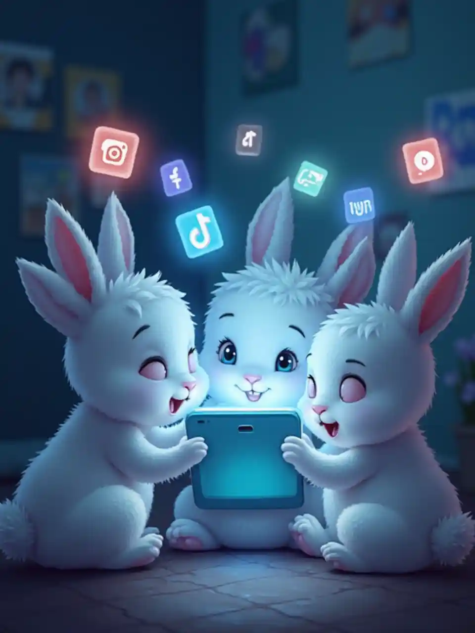 Une image montre un groupe de lapins blancs à paroi rouge, avec une paire d'yeux grands et expressifs, se concentrant sur le smartphone tenu par l'un des lapins. L'écran du téléphone émet une lumière bleue cool, illumine le lapin qui le tient et jette une lumière douce sur les autres. Les icônes lumineuses d'Instagram, de TikTok et de YouTube, ainsi que des éléments d'interface similaires aux notifications sur les réseaux sociaux et aux vues de profil, flottent autour de lapins et semblent provenir de téléphones portables. Certains de ces lapins regardent directement l'écran du téléphone, tandis que d'autres regardent ou s'étendent vers l'icône flottante. En arrière-plan se trouve une pièce faiblement éclairée dont les murs prennent des formes floues, pouvant suggérer des affiches ou des images. L'éclairage général est doux et diffus, et la lumière cool émise par l'écran du téléphone portable contraste avec la lumière ambiante chaude à l'arrière-plan. Les lapins doivent être visibles sur la fourrure d'une fine lumière haute, les nuances douces doivent définir leur morphologie. Le ton visuel doit être fantaisiste et numérique, véhiculant l'immersion du contenu en ligne