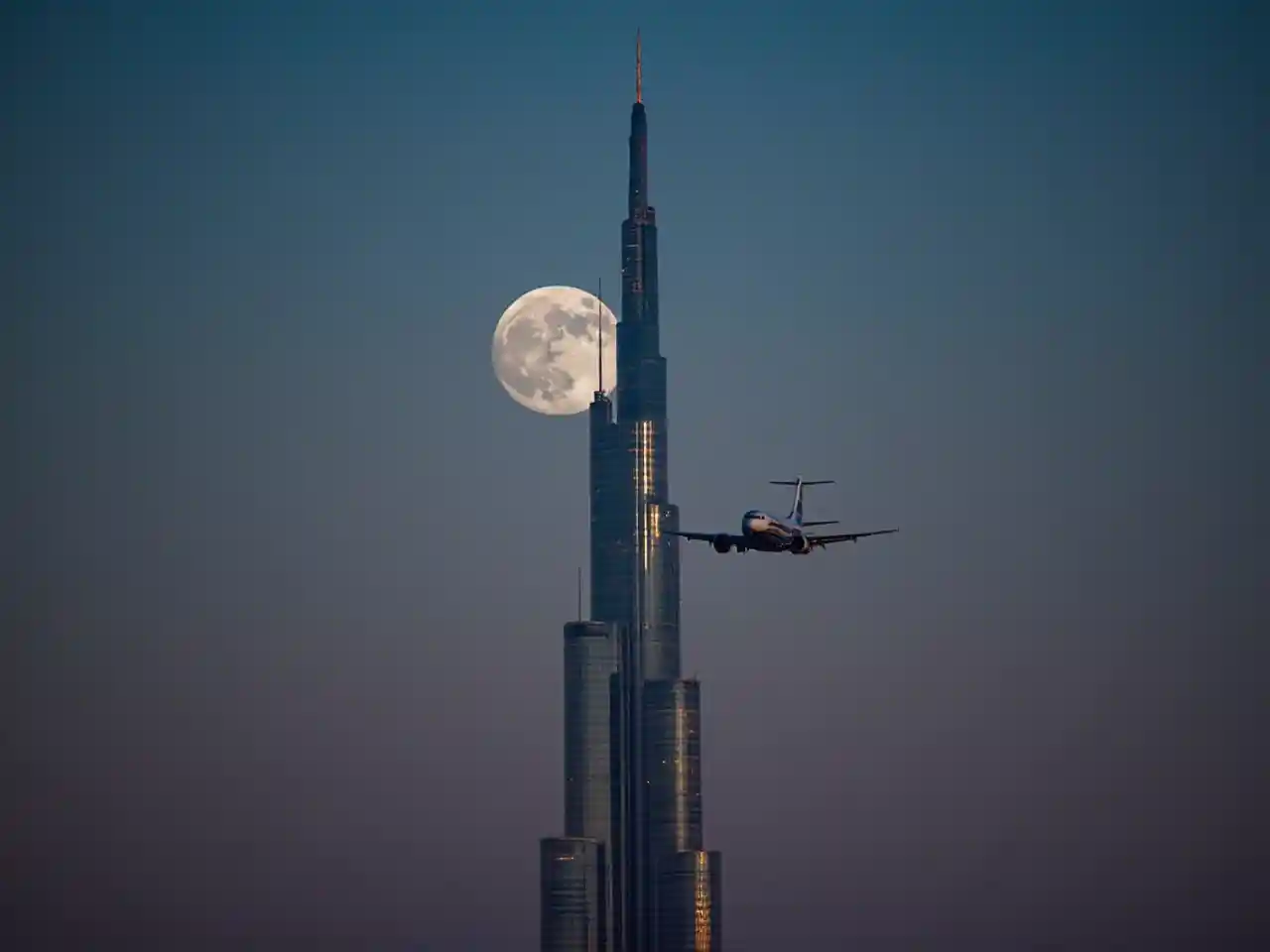 Burj Khalifa après la pleine lune, un avion vole devant.