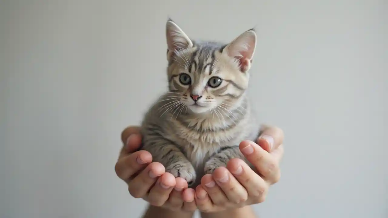 IsaiahUn chat est assis dans la main d'un humain, derrière un fond gris et blanc, le chat a une petite patte blanche sur son corps, Carlos Catasse, superflat, tiny, une photo d'inventaire