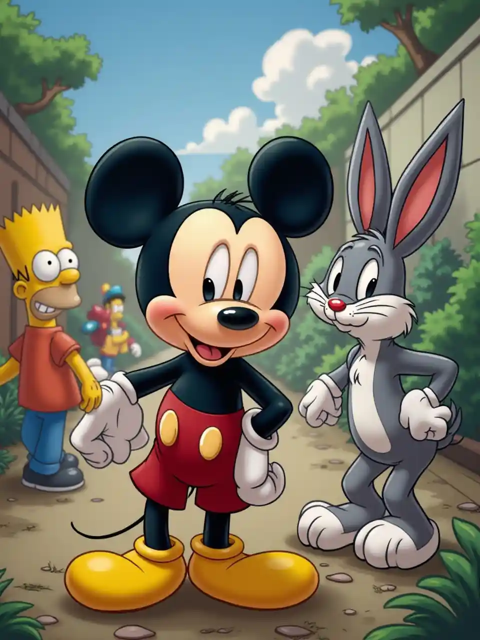 Un personnage de dessin animé, comme Mickey Mouse, Bugs Bunny ou Homer Simpson, regarde la caméra