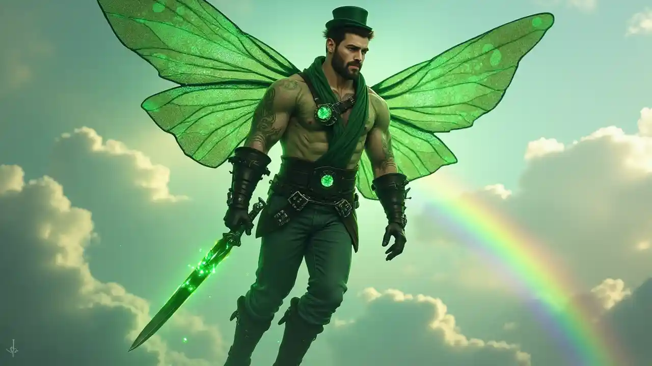 Le masculin ultra masculin. Origine celtique. Les fées, en partie les elfes. Petit et gros, mais en pleine forme. Les épaules sont larges, la poitrine large et la taille étroite. La peau claire, les yeux vert jade étincelants. Cheveux très courts et châtain foncé, souvent lisse vers l'arrière/peigné vers l'arrière, avec un chapeau haut de forme en velours vert sur le dessus de la tête. Beau visage, regard rugueux. Sourcils et mentons épais, barbiche marron foncé sur le visage. Il porte une chemise purement verte en maille avec diverses nuances de motifs tourbillonnants verts; elle est bien ajustée sur sa poitrine. Il porte un poignet en cuir noir sur son bras et une ceinture incrustée de cuir noir autour de sa taille. Cette ceinture comporte une énorme boucle de ceinture en émeraude vert. Jeans verts ajustés, grandes bottes en cuir noir fourrées dans les jambes, avec des boucles argentées. Il a une paire d'ailes de libellule, vert et translucide - il les utilise pour voler. Il brille d'un halo vert brillant, laissant une trace de poussière lutin verte scintillante partout où il va. Il brille comme une étoile. Il portait une épée courte argentée lumineuse dont la poignée était ornée d'émeraudes. Tout le corps pose, survole les nuages, l'arc-en-ciel vole dans le ciel.
