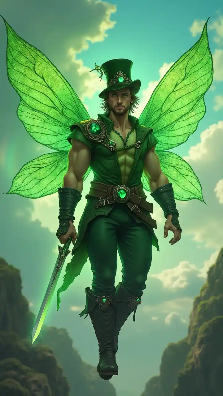 Fée d'origine celtique/irlandaise. Les fées, en partie les elfes. Épéiste, guerrier. Petit et gros, mais musclé et en très bonne forme. Masculin blanc masculin. Épaules larges, poitrine large, taille étroite. La peau claire, les yeux vert jade étincelants. Cheveux très courts et châtain foncé, souvent lisse vers l'arrière/peigné vers l'arrière, avec un chapeau haut de forme en velours vert sur le dessus de la tête. Beau visage, regard rugueux. Sourcils et mentons épais, barbiche marron foncé sur le visage, sourires mignons. Il portait une chemise en filet vert transparent translucide à manches longues avec divers motifs de tourbillon vert foncé; elle était bien ajustée sur sa poitrine. Bracelet en cuir noir sur le bras et ceinture en cuir noir autour de la taille. Cette ceinture comporte une énorme boucle de ceinture en émeraude vert. Jeans verts ajustés, grandes bottes en cuir noir fourrées dans les jambes, avec des boucles argentées. Il a une paire d'ailes de libellule géantes, vert et translucide - il les utilise pour voler. Il dégage un halo vert brillant qui laisse une trace de poussière lutin verte scintillante partout où il va. Il scintille comme une étoile. Il portait une épée courte argentée lumineuse dont la poignée était ornée d'émeraudes. Tout le corps pose, survole les nuages, l'arc-en-ciel vole dans le ciel.