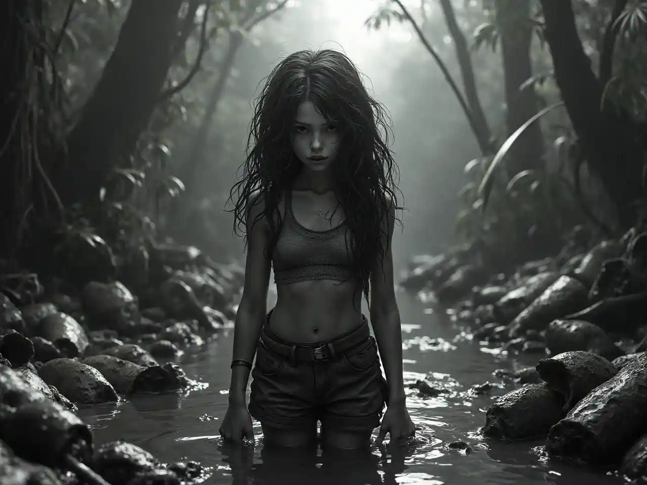 La jungle trempée par la pluie et le marais trouble rempli d'eau débordante formaient l'arrière-plan. Une jeune fille elfe se tenait là. Son visage est devenu le point de mire dans un tourbillon chaotique entouré de divers débris, suggérant qu'elle semblait être submergée dans sa lutte. Sa jeunesse contraste fortement avec l'environnement chaotique et poubelle, créant une composition provocatrice dans un ton noir et blanc capricieux. Le rendu des éléments est médiocre, l'anatomie est défectueuse, caractérisée par des membres disloqués ou superflus, certains déconnectés ou mutés, mélangeant de manière troublante beauté et désordre grotesque, brouillés par des contrastes stridents et saturés.