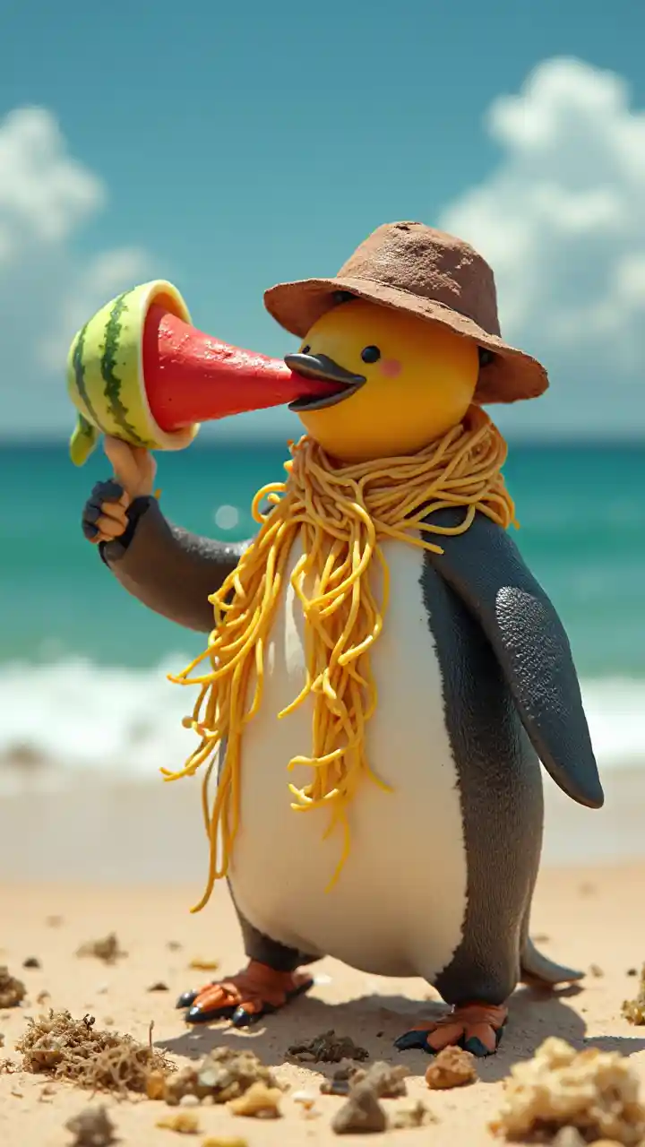 Un manchot avec une tête de fromage, vêtu d'un costume de spaghetti et d'un chapeau en chocolat, se promène sur la plage des lasagnes et chante "Volare" dans un mégaphone de pastèque.