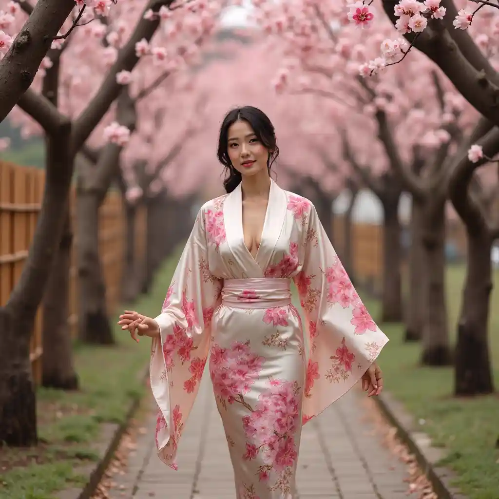 Une femme d'origine asiatique, âgée d'une trentaine d'années, se balance dans une forêt de cerisiers en fleurs, vêtue d'un décolleté profond et d'un kimono en soie brodé d'orchidées, qui fascine. Elle est encadrée par des pétales et des écrans en bambou, et ses jambes élancées et sa poitrine proéminente dégagent une élégance paisible et un charme séduisant dans un environnement paisible et traditionnel.