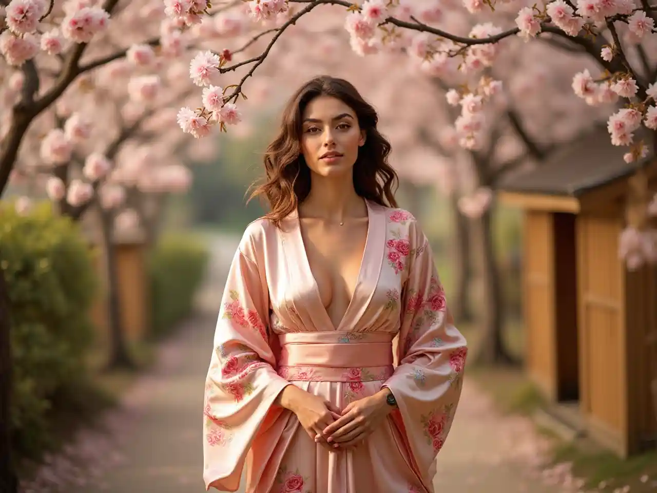 Une femme du Moyen-Orient d'une trentaine d'années pose dans une forêt de cerisiers en fleurs, vêtue d'un décolleté profond et d'un kimono en soie brodé de lotus, rayonnante. Elle est encadrée par des pétales et des écrans en bambou, et ses jambes bien proportionnées et son décolleté bas dégagent une élégance sereine et un charme séduisant dans un environnement paisible et traditionnel.