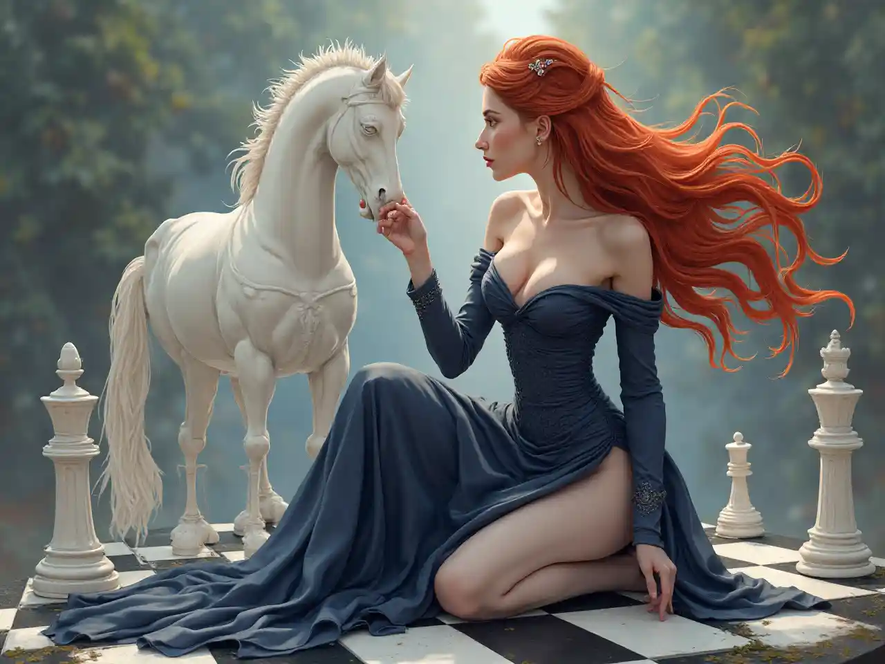 L'un ((((époustouflante illustration corporelle)), caractérisé par une femme calme (((longue, élégante chevelure rouge))), porté avec élégance (((longue robe à carreaux bleu foncé et blanc)), complété par un élégant ((((chevalier blanc))) se tenant sur (échiquier) avec confiance, se préparant à une contemplation sereine qui capte chaque détail, du point de vue (ultra-réaliste, haute résolution)