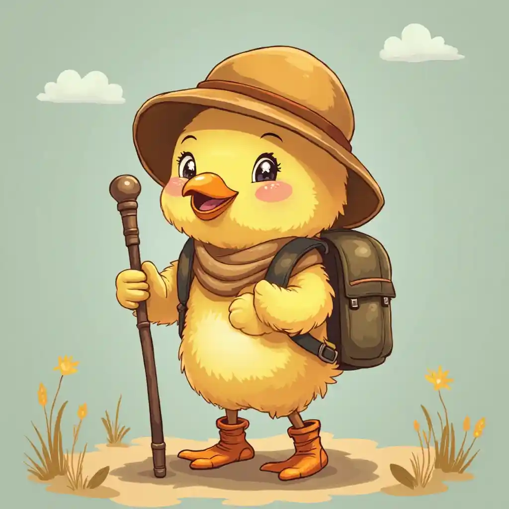 Bébé dessin animé poussin, athlète, canne, chapeau, bottes, gants, sac à dos