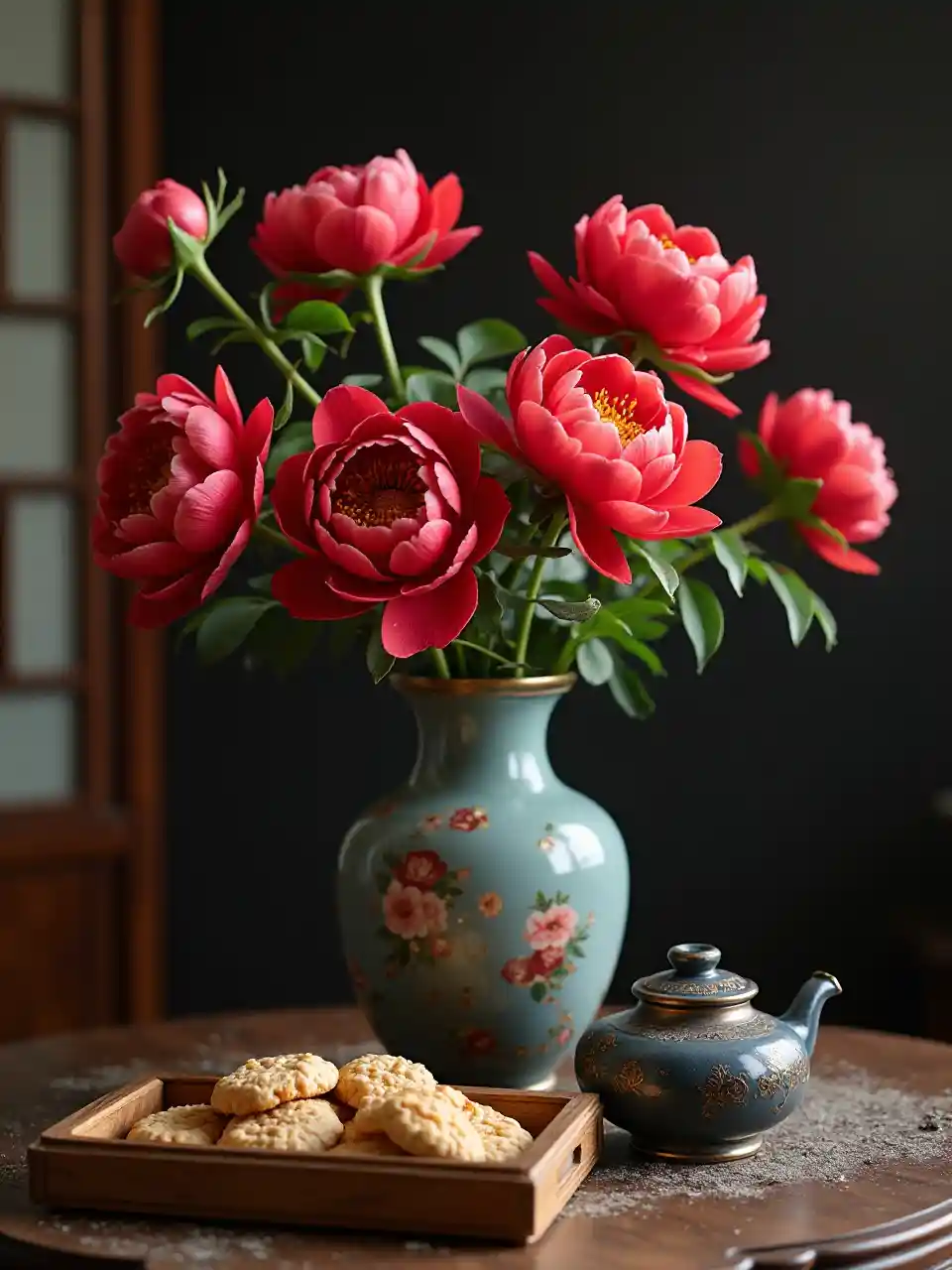 WilliamFleurs de pivoine rouge, vases traditionnels chinois, théières traditionnelles chinoises, belles tables en bois, boîtes de biscuits, images de nature morte disposées harmonieusement