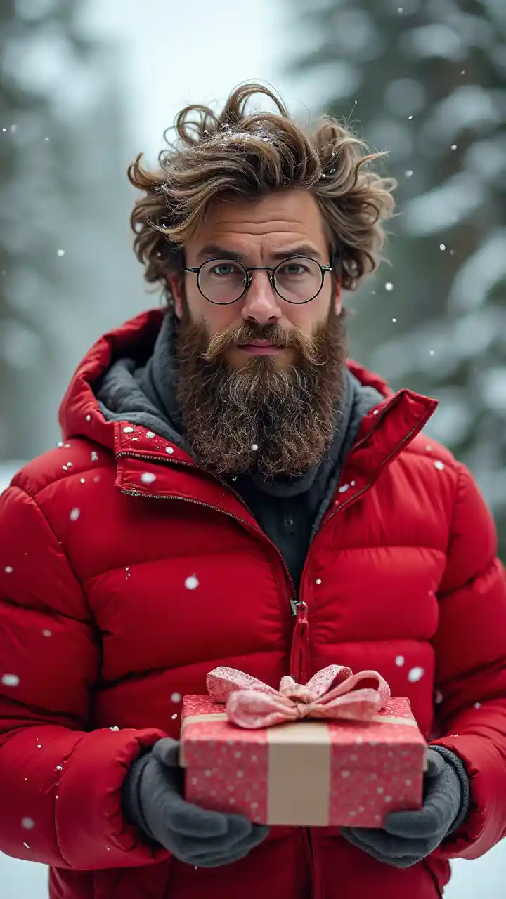 EmeryPortrait d'un homme vêtu d'une doudoune rouge et de lunettes de roseau avec une barbe bouclée, caméra frontale debout avec un coffret cadeau, temps de neige, heure de Noël, fond flou