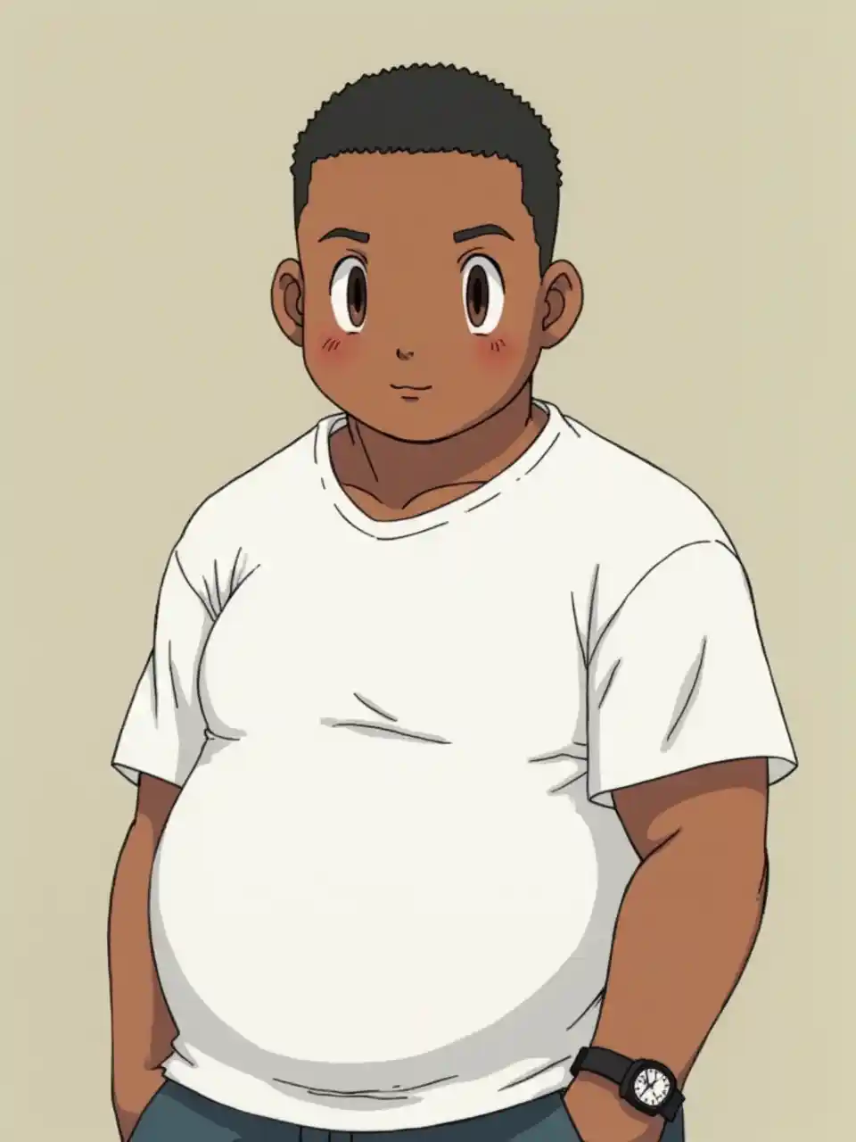 Face au spectateur, portrait ultra-détaillé du haut du corps d'un jeune adulte noir joufflu, à la peau chocolatée au lait et aux cheveux bruns courts et rasés. Tête ronde. La stature est large. Visage rond, yeux marron foncé, nez large et grand. Il portait une chemise blanche et une montre analogique noire au poignet droit. Un fond monochrome simple. Dans Pokemon Anime Art Style.