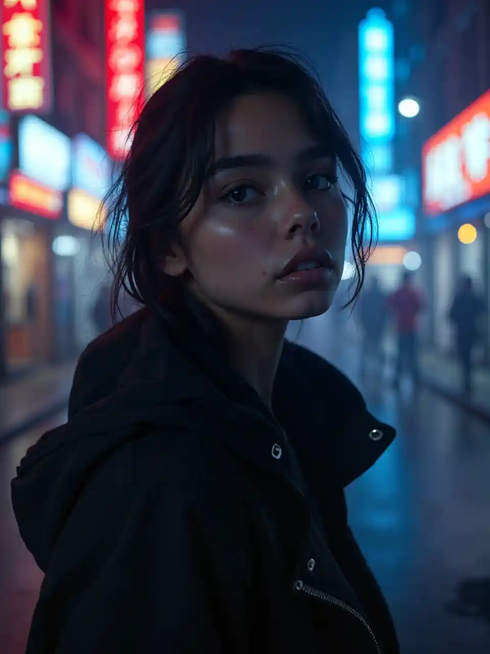 MaverickRue de la ville, néon, brouillard, volume, photo en gros plan de la jeune femme sombre GU g clotheGs