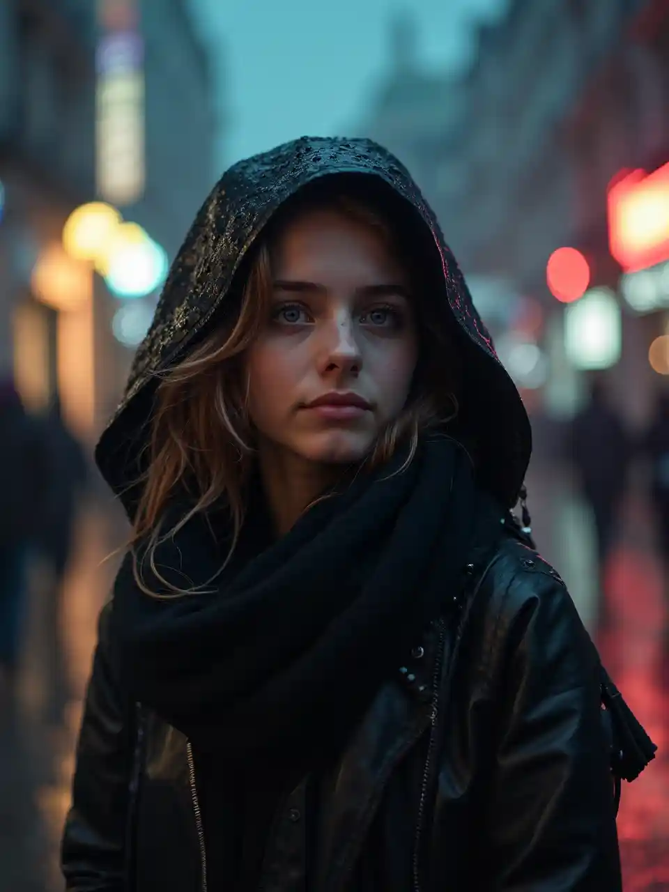 OwenRue de la ville, néon, brouillard, volume, portrait en gros plan d'une jeune femme en tenue sombre Photo d'une fille portant un foulard noir et de la pluie dans les rues de Londres