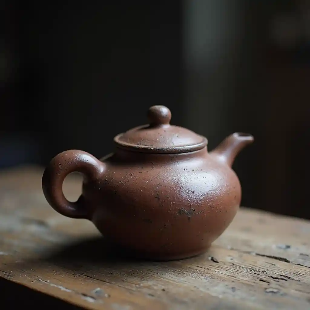 JamesVieille petite théière chinoise glaçée en argile, ambiance profonde, photos réalistes