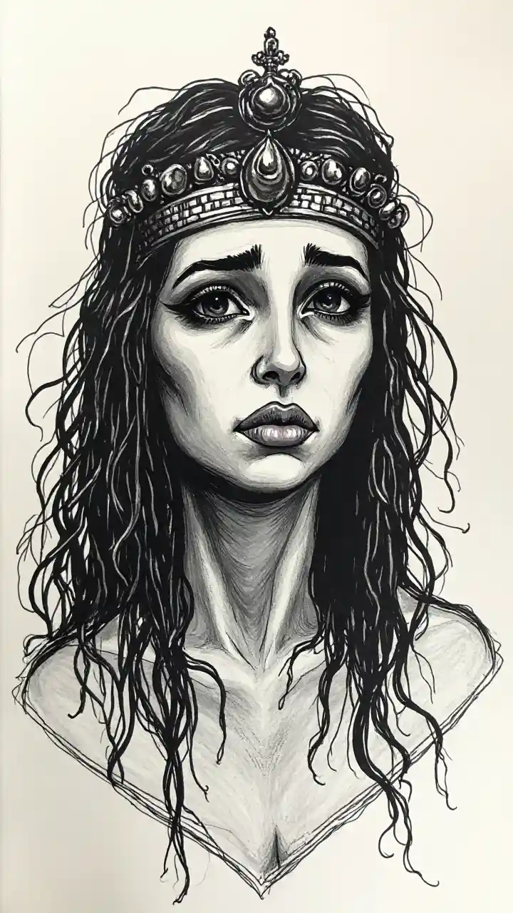 Cléopâtre triste, croquis à l'encre, basse lumière, bas détails,