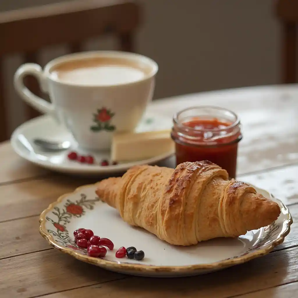 PianeerUn café avec du lait et du sucre et un croissant avec de la confiture