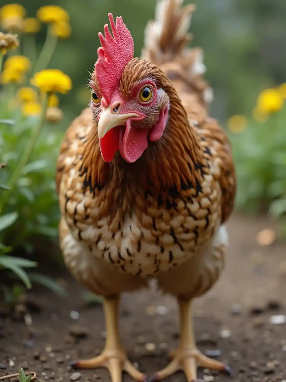 C'est un gros plan sur un poulet, qui a l'air vif et un brin d'humour. Il est riche en coloris de plumes, avec diverses taches marron, blanc et noir. Les plumes ont une texture naturelle, douce, assez méticuleuse. La crête et les épines du poulet sont une sorte de rouge vif, qui est particulièrement proéminent sur le fond de plumes, et ses yeux sont clairement nets et clairs, avec des teintes dorées. Les pattes de poulet sont fortes, les écailles sont distinctes et le sol semble sec et terreux. Au fond, il y a des fleurs jaunes, un flou doux, suggérant un environnement extérieur naturel