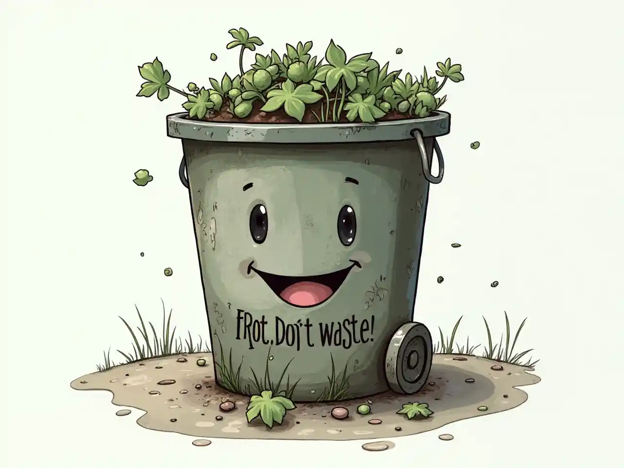 KittyUne boîte de compost souriante avec l'inscription "pourrie, ne la gaspillez pas!" écrit