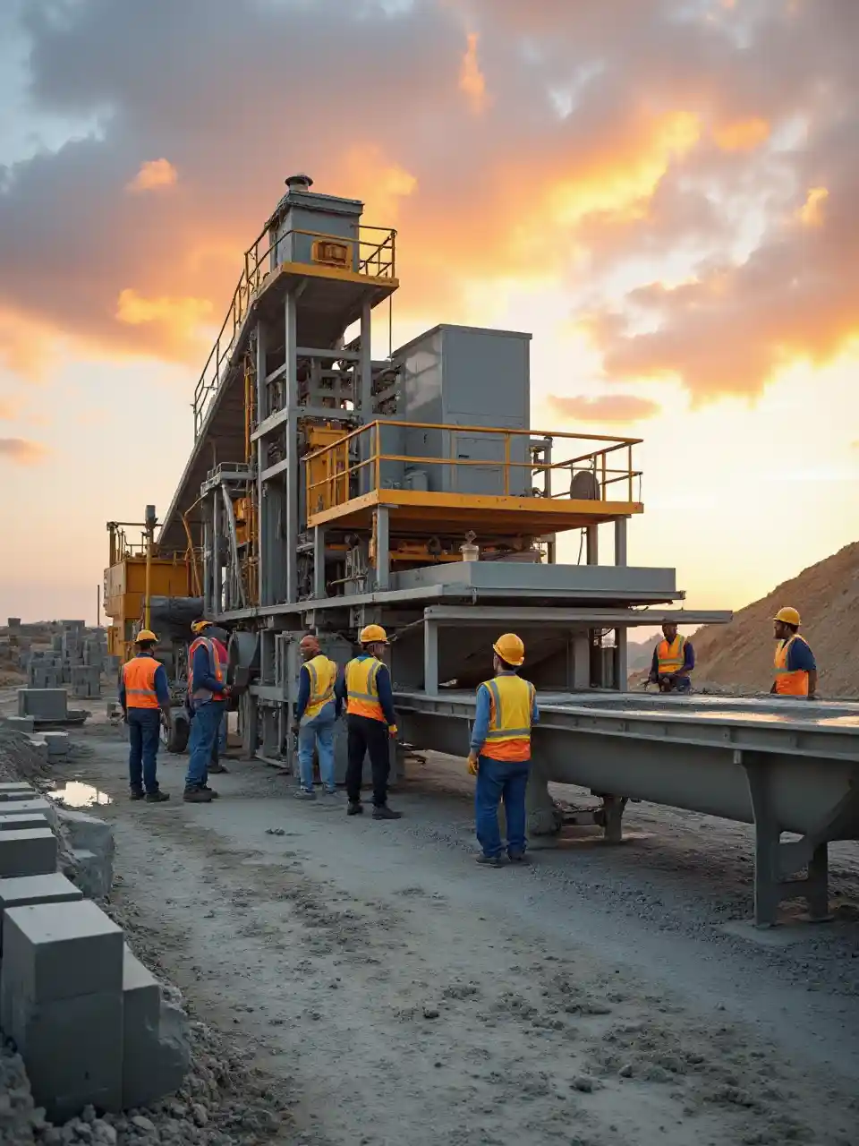 "Une machine à bloquer le béton de pointe fonctionne sur un chantier de construction vide, sous un ciel à couper le souffle, rempli de couleurs chaudes du lever ou du coucher du soleil. La machine est volumineuse, moderne, bien entretenue et produit activement des blocs de béton de forme parfaite. J'ai vu 10 travailleurs dévoués, vêtus d'équipements de sécurité (casques, gants, gilets réfléchissants), manipulant activement les mélanges de béton et disposant des blocs pour assurer un bon fonctionnement. Le sol est recouvert de béton frais et des tas de blocs nouvellement construits sont soigneusement disposés à proximité. La scène capture l'énergie de la collaboration d'équipe et de l'artisanat industriel, et intègre la technologie et les efforts humains dans une composition visuellement étonnante. "