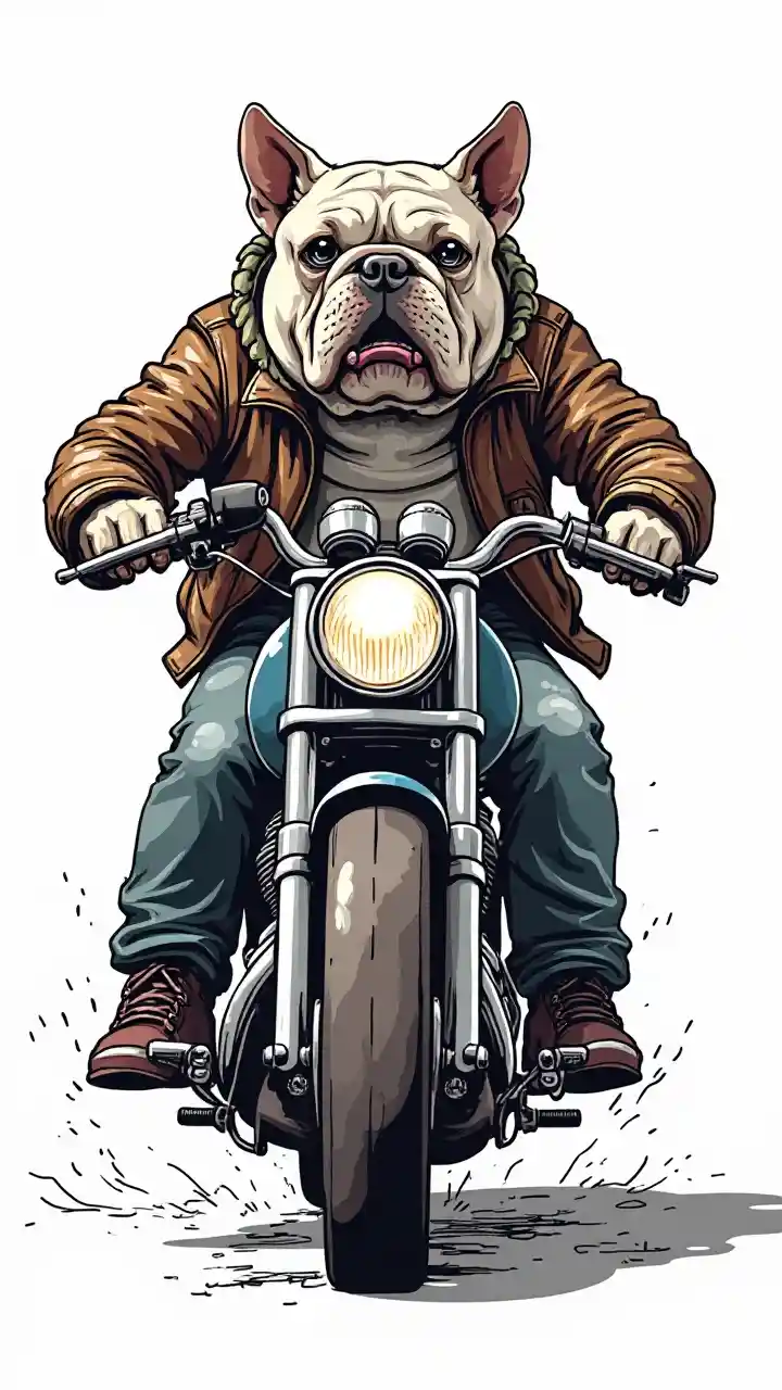 EmeryUn pitbull en blouson de cuir qui roule à moto, avec un style minimaliste, des lignes artistiques vectorielles, des bandes dessinées artistiques sur fond blanc