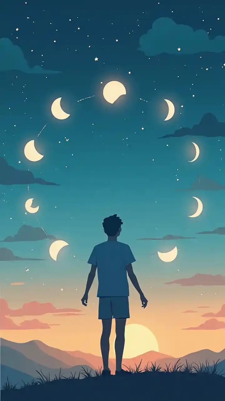 La figure de l'adolescent est entourée de 11 icônes de la lune, avec les changements répétés du ciel du jour à la nuit - vecteurs d'images d'information, ombres lisses, couleurs douces de l'univers, design minimaliste Kurzgesagt