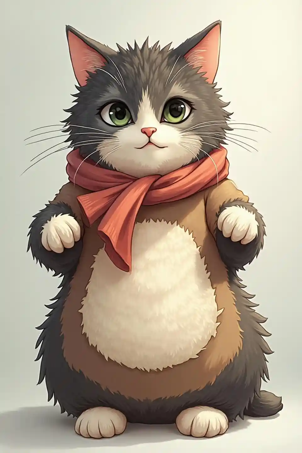 Le haut du corps est composé, dodu (chat noir et blanc tacheté de fleurs), (forme de chat), le haut du corps du chat porte des vêtements de cuisine longs et la fourrure poilue dépasse