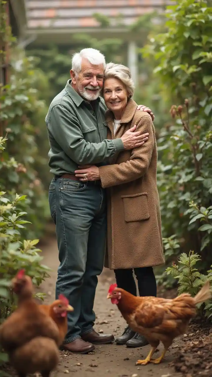 Des couples âgés pris dans les bras par des chats et des poules devant les plantes