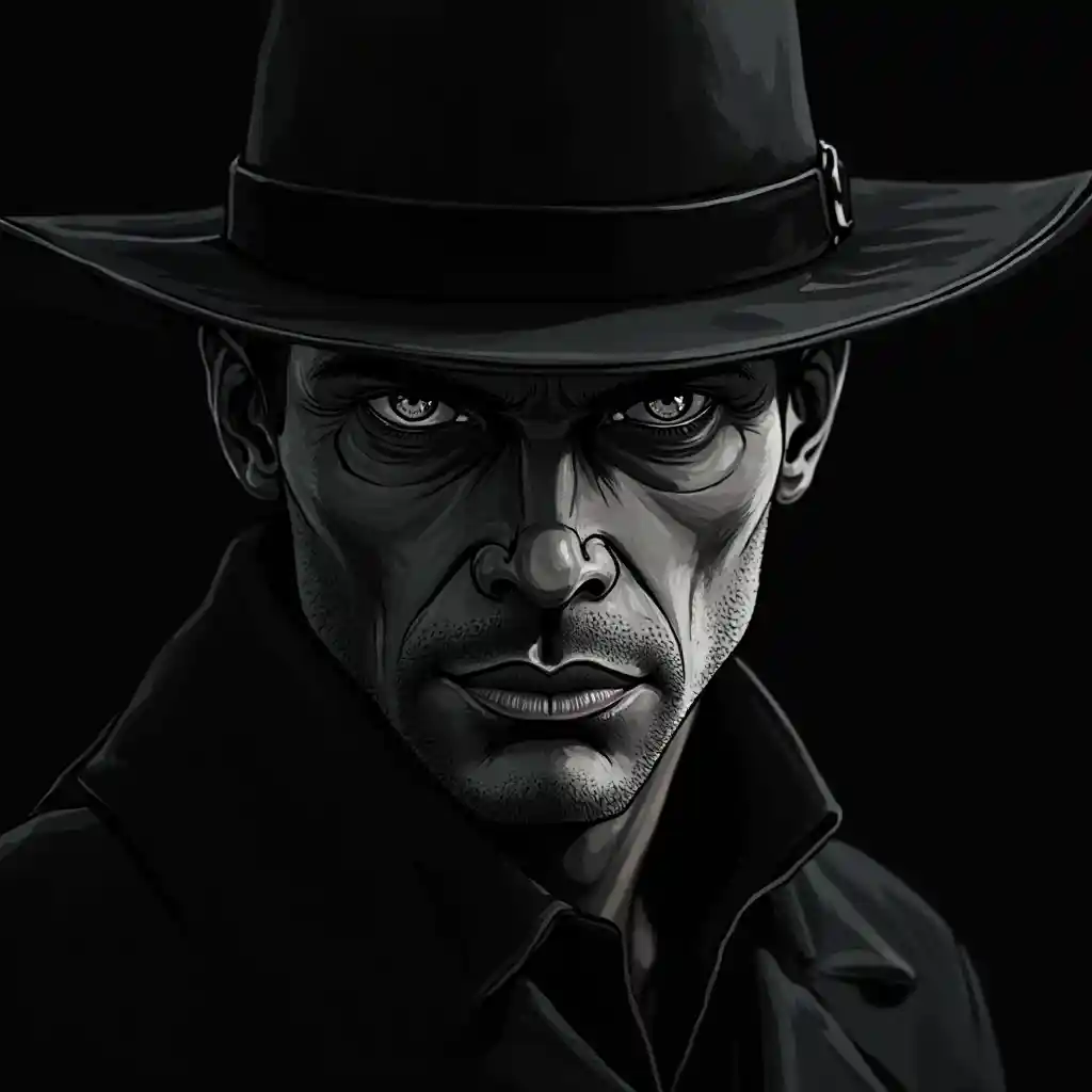 A [Cowboy] Visage sur fond noir, dans un style d'illustration ultra-réaliste, blanc clair et argent foncé, contraste clair-obscur, art de la bande dessinée noire, peinture monochrome, regard intense --ar 3:2