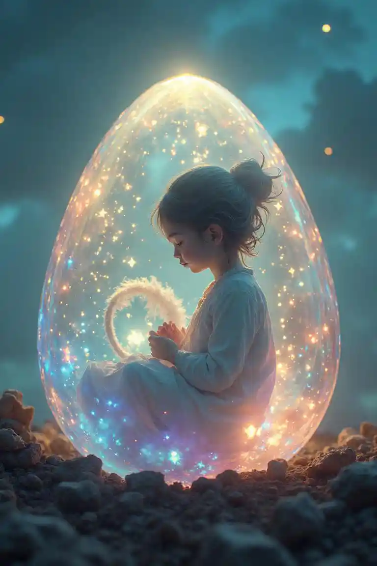 Une fille aux yeux cernés, à la queue bouclée et à la position fœtale. A l'intérieur se trouve un énorme oeuf de cristal holographique transparent. Rayonnante. Tombé du ciel