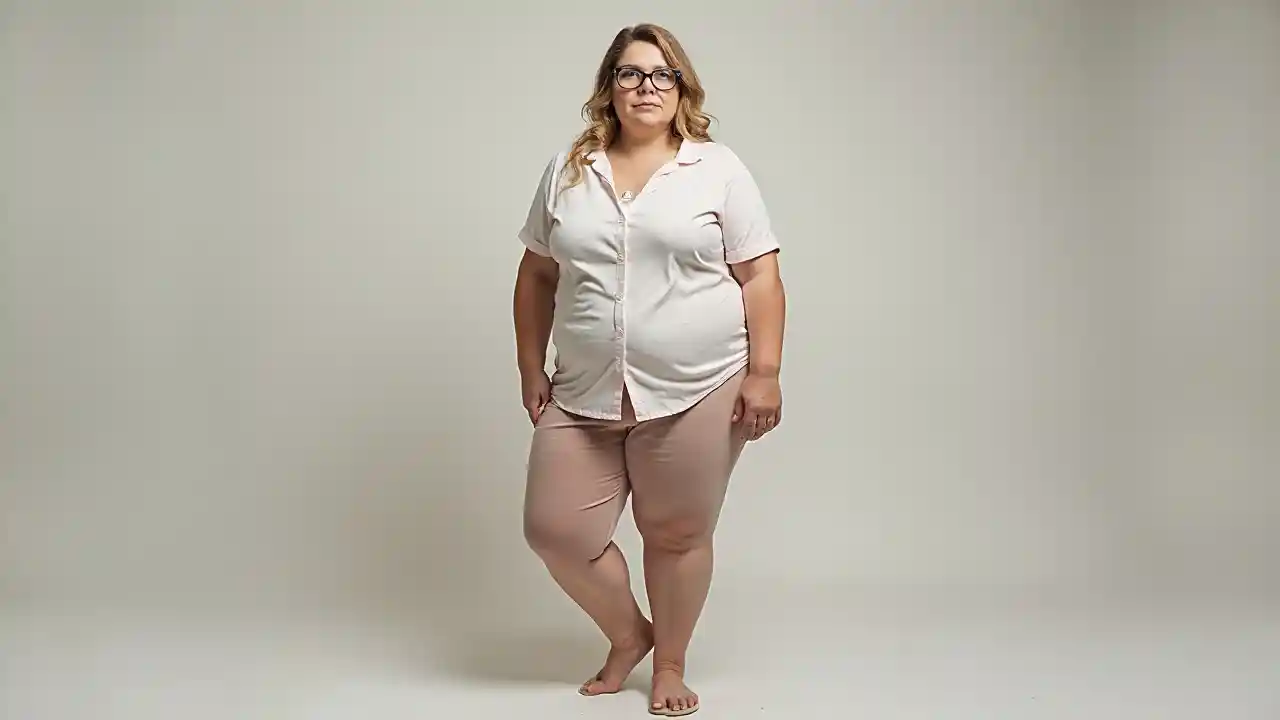 En pleine forme, elle est en surpoids et très grosse, XXL, 40 ans, grosse femme européenne blanche, en pyjama deux pièces, debout en sandales plates