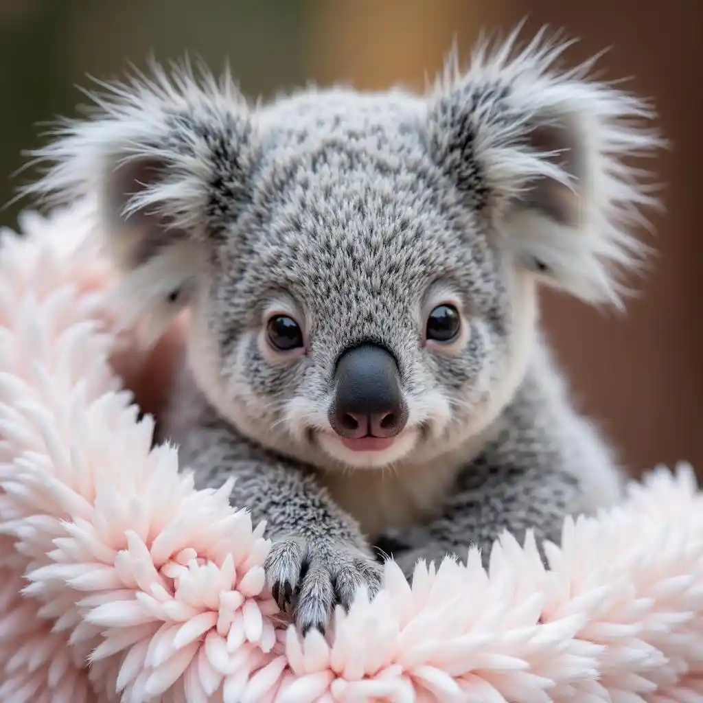 Le petit koala le plus mignon que vous ayez jamais vu, avec de beaux yeux, un nez mignon, des oreilles moelleuses. Koala regarde un visage mignon dans la caméra et sourit tendrement. Vêtu de couvertures blanches et roses, il photographie en haute définition. Cette photo de qualité montre les traits ultra-détaillés et la texture naturelle de la fourrure de ce petit animal poilu. Avec une haute définition, une distance focale et une résolution, les images soulignent la beauté naturelle de cette créature mignonne sous la lumière naturelle. L'ambiance s'annonce mignonne