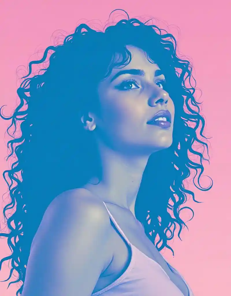 TinaMid Journey, design graphique duotone, bas angle, femme, silhouette cyber bleu sur fond rose pastel, cheveux longs et bouclés, petit nez et lèvres plantureuses, pose dynamique, d