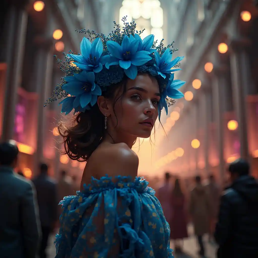 Portrait de femme couronne bleue, vogue, intérieur de la grande cathédrale gothique, lumières dramatiques, détails incroyablement hauts, cyberpunk, soleil, couleurs saturées, symétrie, fond de foule, panorama profond, néons