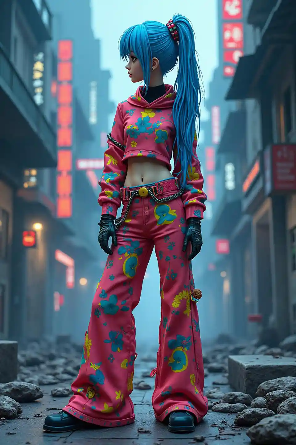 JaxonVêtements du futur (vêtus de vêtements colorés) filles, cheveux bleus, (ruines urbaines cyberpunk après la guerre thermonucléaire, néons), détails visages larges t