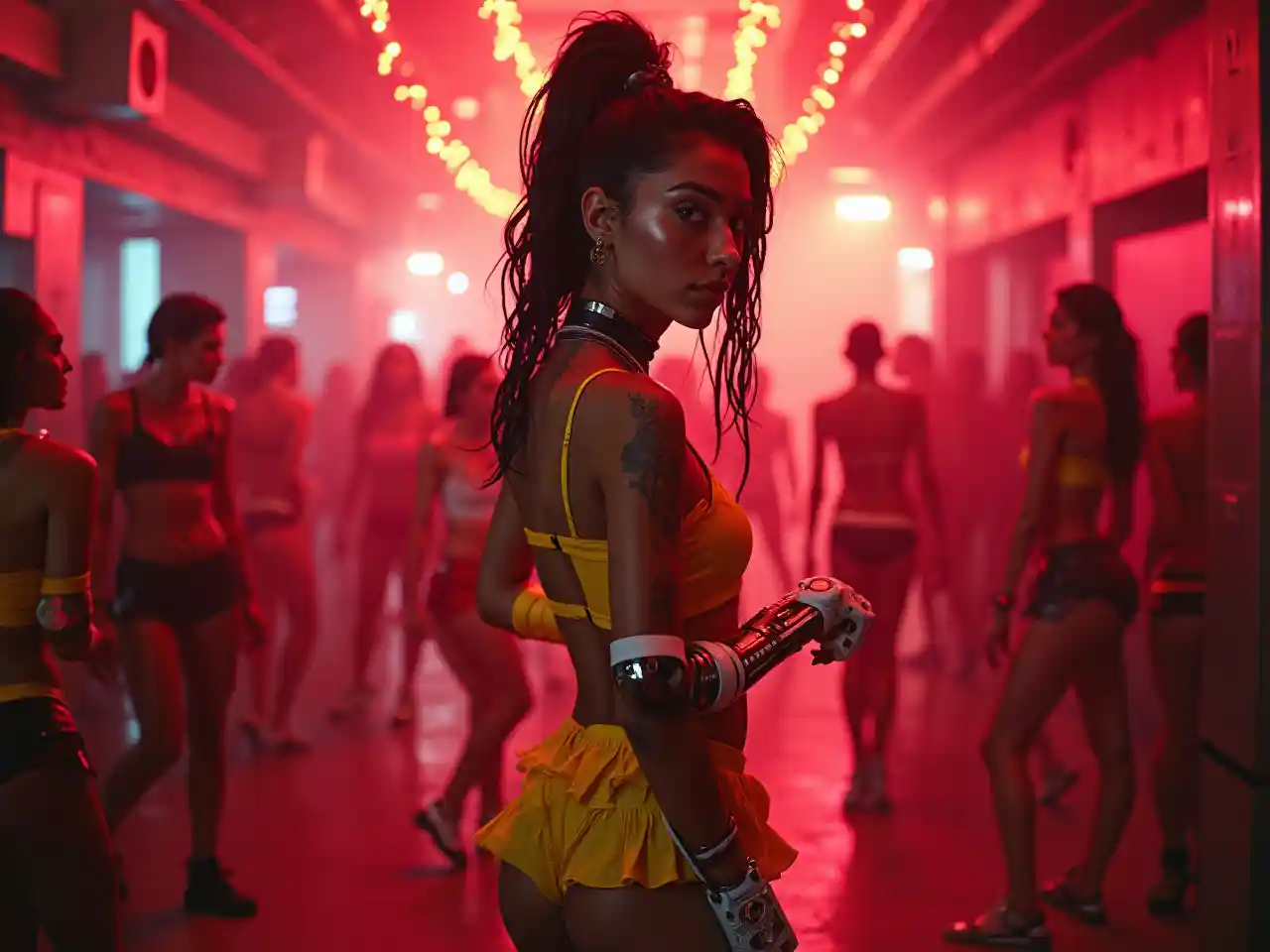 Elégantes filles cyberpunk, peau marron en plastique translucide, dans un club de danse sombre et robuste éclairé par un rouge rose fluo industriel étroit, entouré de danseurs, bras robotisés et accessoires cybernétiques, postures de corps entier, cheveux noirs, jaunes et orange tendance, matériaux translucides, belle lumière brumeuse, lodress, formes, tatouages, la couleur de sa tenue est le jaune aux accents blancs, dorés et orange