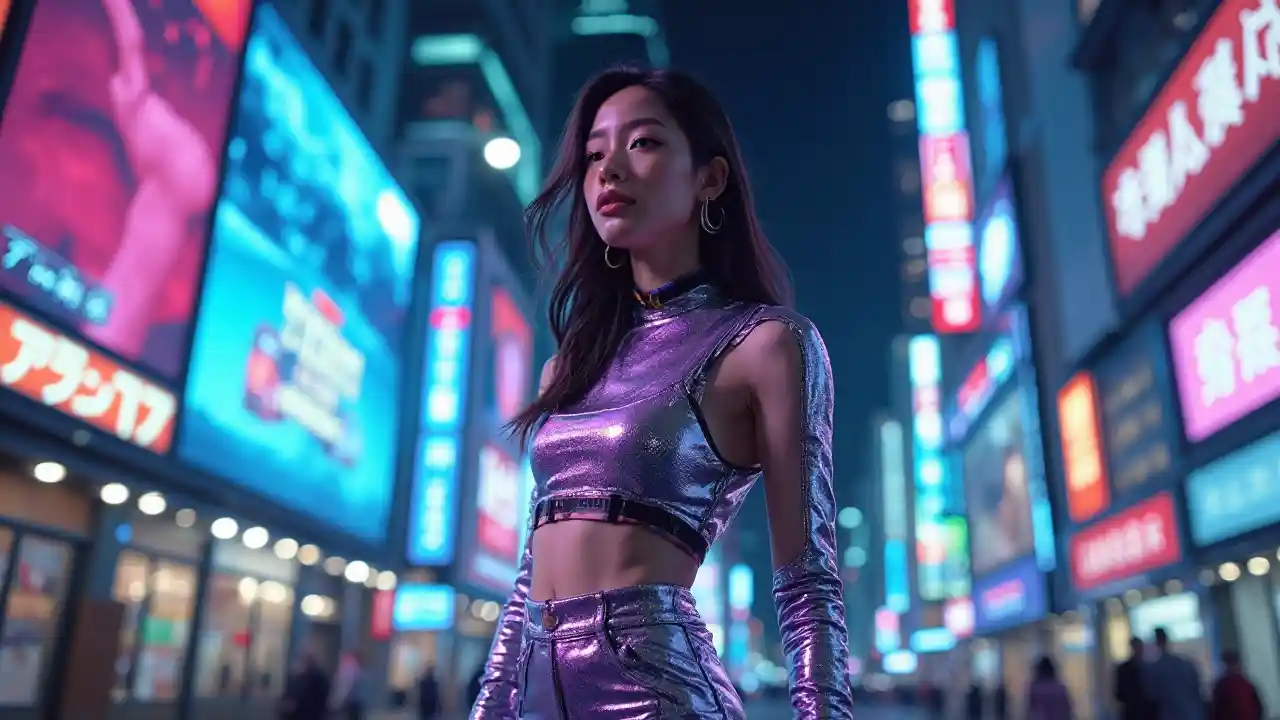 Une femme d'origine asiatique, âgée d'une trentaine d'années, s'est fait une combinaison futuriste dans la cité cyberpunk, brillant sous un panneau d'affichage holographique. Les néons magnifient sa posture assurée, et sa silhouette élégante dégage une séduction audacieuse.