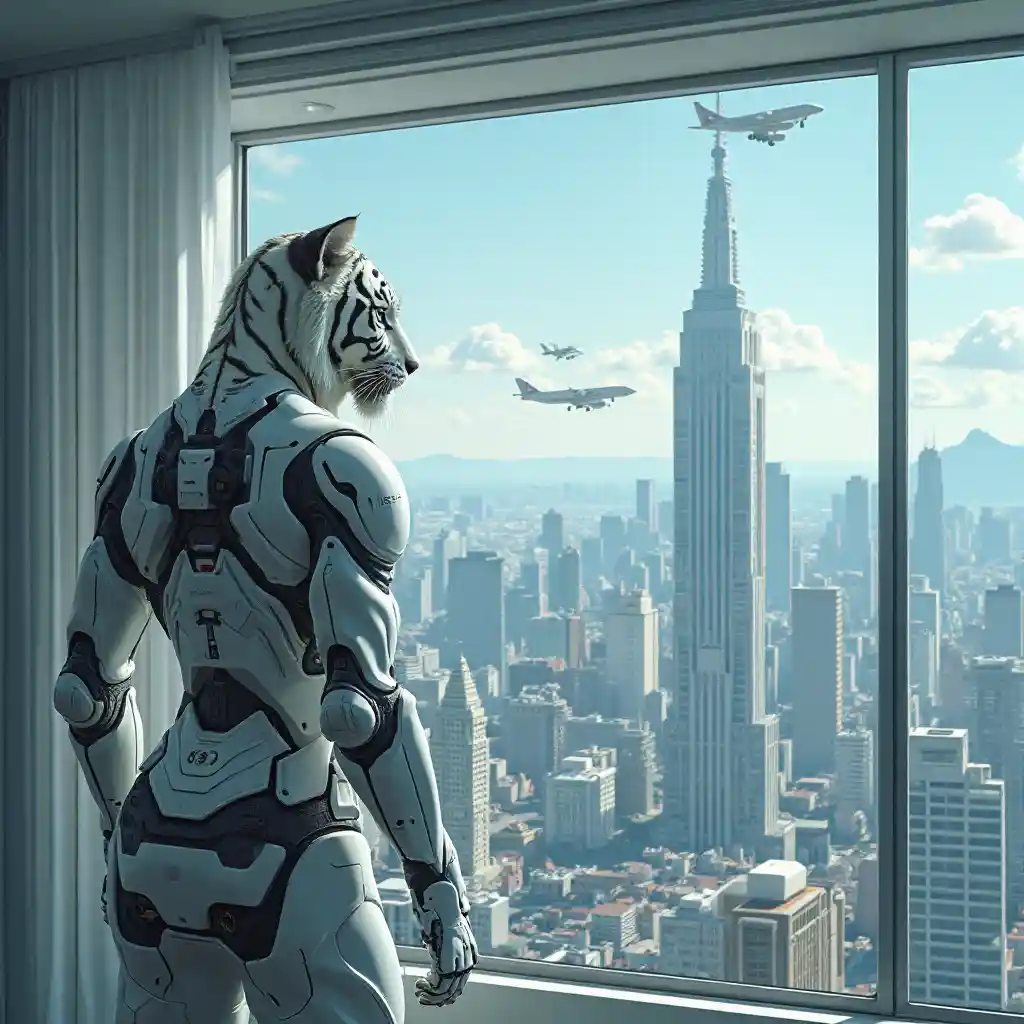 Tigre blanc en costume semi-robotique Debout dans une salle de sport futuriste Regardez la fenêtre pour voir la ville whi il y a beaucoup de gratte-ciel et d'avions dans le ciel
