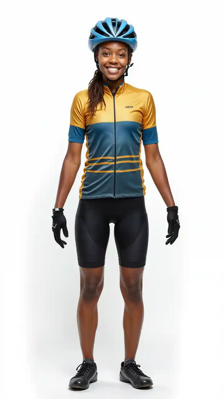 Femme noire de 18 ans, debout, plate face vers l'avant, sans perspective, souriante, coupée de la cuisse à la tête, bras qui sortent du corps, avant-bras croisés en X, uniforme de cyclisme bleu doré, gants de cyclisme noirs, casque de cyclisme bleu, short de cyclisme noir, fond blanc net, pas de détails