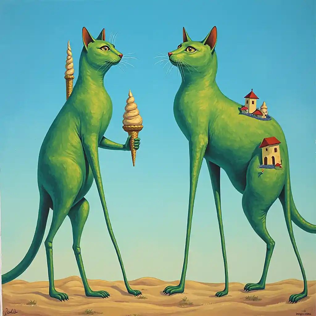 OliverChat vert aux pattes très longues et fines. Le chat derrière la maison et le cornet de glace peint dans le style de Salvador Dalí. Ciel bleu.