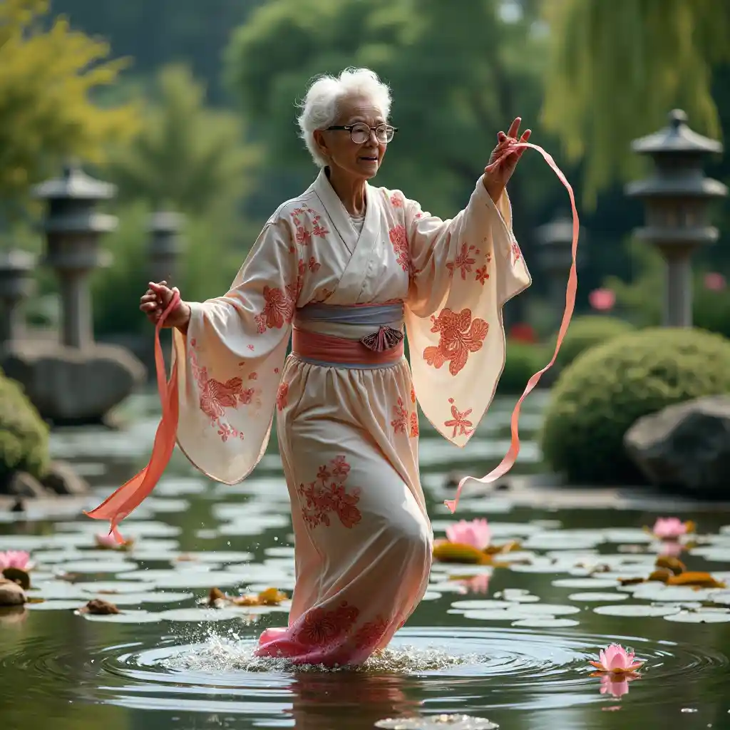 Les rubans dansent dans le jardin de lotus, et la vieille dame noire de 76 ans portant des lunettes porte un kimono brodé de pétales. L'étang koi et les lanternes de pierre l'encadrent, et sa rotation élégante dégage élégance et sérénité dans un environnement paisible et traditionnel. Ses mouvements coulent comme de l'eau.