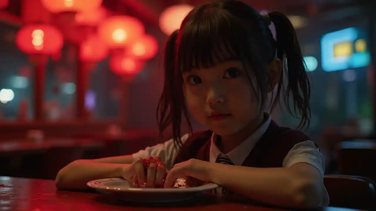 Portrait d'une jeune Asiatique de 7 ans assise dans une boîte de nuit de comptoir, visage dans un film, mains ensanglantées sur une assiette, vêtements d'école, cheveux noirs, lumière chinoise rouge, mise en lumière sur une fille, lumière rouge, lueur de lumière, ambiance sombre