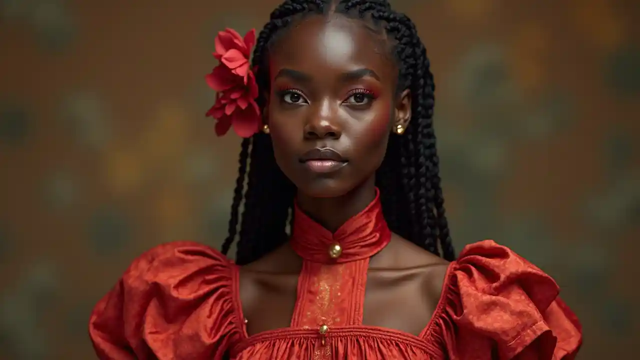 Belle mannequin africaine sombre aux tresses noires, chemise à manches bulles africaines aux allures de fleur hibbusque rouge avec col évêque