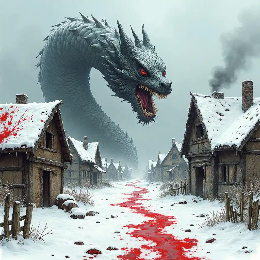 ((Guangpai)), (Neigé, village médiéval reculé)) Enfoulé dans la neige flottante avec des huttes au toit de chaume et des clôtures en bois brisées. Un monstre (( *Hydra à deux têtes *Les deux têtes de)) rugissent d'un corps géant. Dans ces cabines, (les murs effondrés, les poutres de toit brisées, la fumée montante suggèrent une attaque dévastatrice récente). Des éclaboussures d'eau rouge foncé colorent la neige et les murs, avec une trace de rouge foncé entre les empreintes de pas. Des fouets de neige traversent la scène. :: Illustration d'horreur fantastique sombre:: (style d'encre et de dessin en graphite):: ((apparence peinte à la main)) par *Gérard Brom *,*Ian Miller *,*Zdzis ł aw Beksi ń ski*:: (((texture tenace)):: ((ambiance de mauvaise humeur)):: *Antique *,*Hanté *,*Lavage à froid *