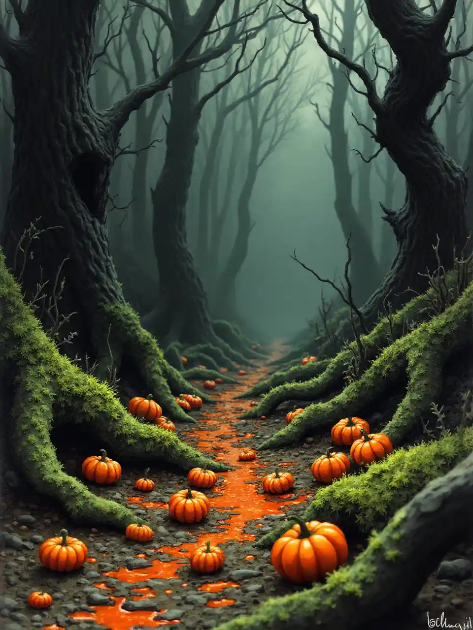Arbres tordus et graines de citrouille au sol d'une forêt morose