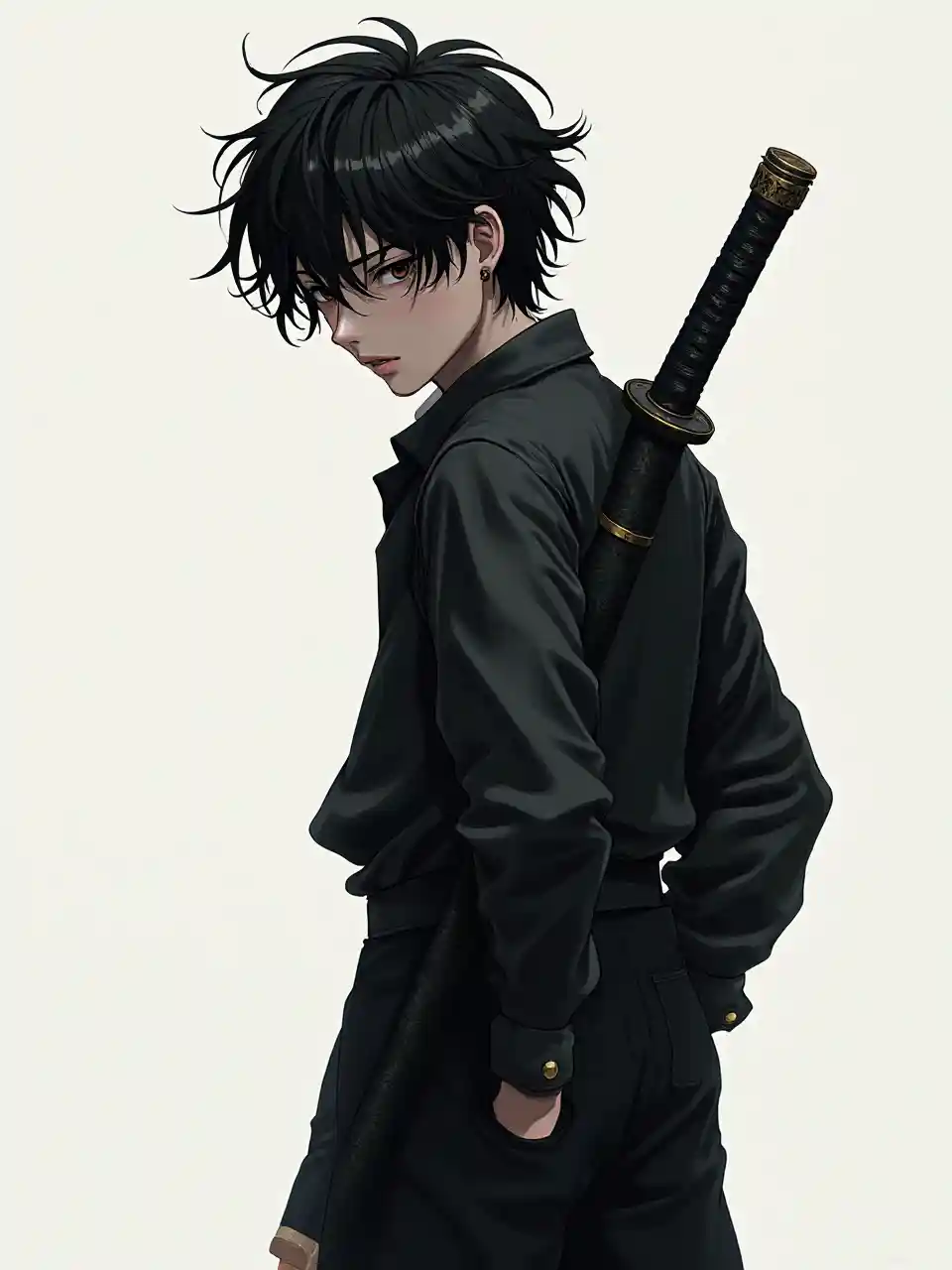 Un homme brun et en désordre, chemise noire avec katana et pantalon noir sur le dos