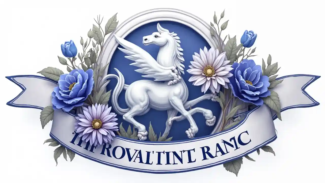 Un badge blanc et bleu avec des fleurs et un ruban entouré d'un héros pourpre royal, un groupe écossais, David Ramsay Hay, un réalisme onirique, un logo, un rendu numérique