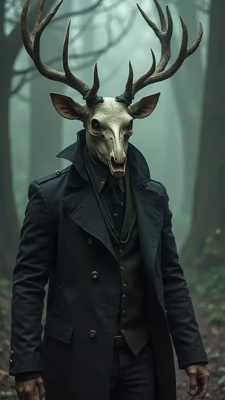 Art numérique Dark Fantasy Un détective humanoïde dirigé par un crâne de cerf