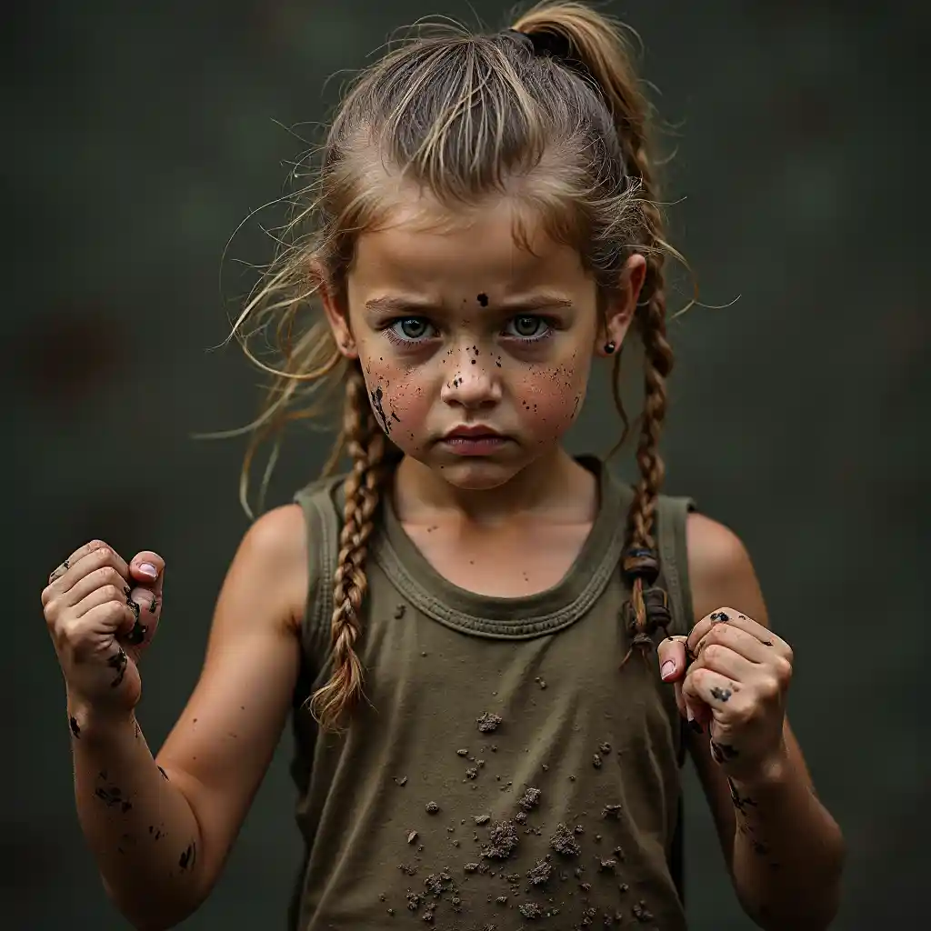 Une jeune fille provocante se tient debout dans une posture féroce, ses vêtements couverts de boue et son nez qui coule légèrement. Poings serrés, les yeux remplis de détermination inébranlable, elle incarne l'esprit rebelle et est prête à relever n'importe quel défi qu'elle rencontrera. Ses cheveux en désordre dessinent un visage couvert de rayures de saleté, mais son regard reste concentré et inébranlable.