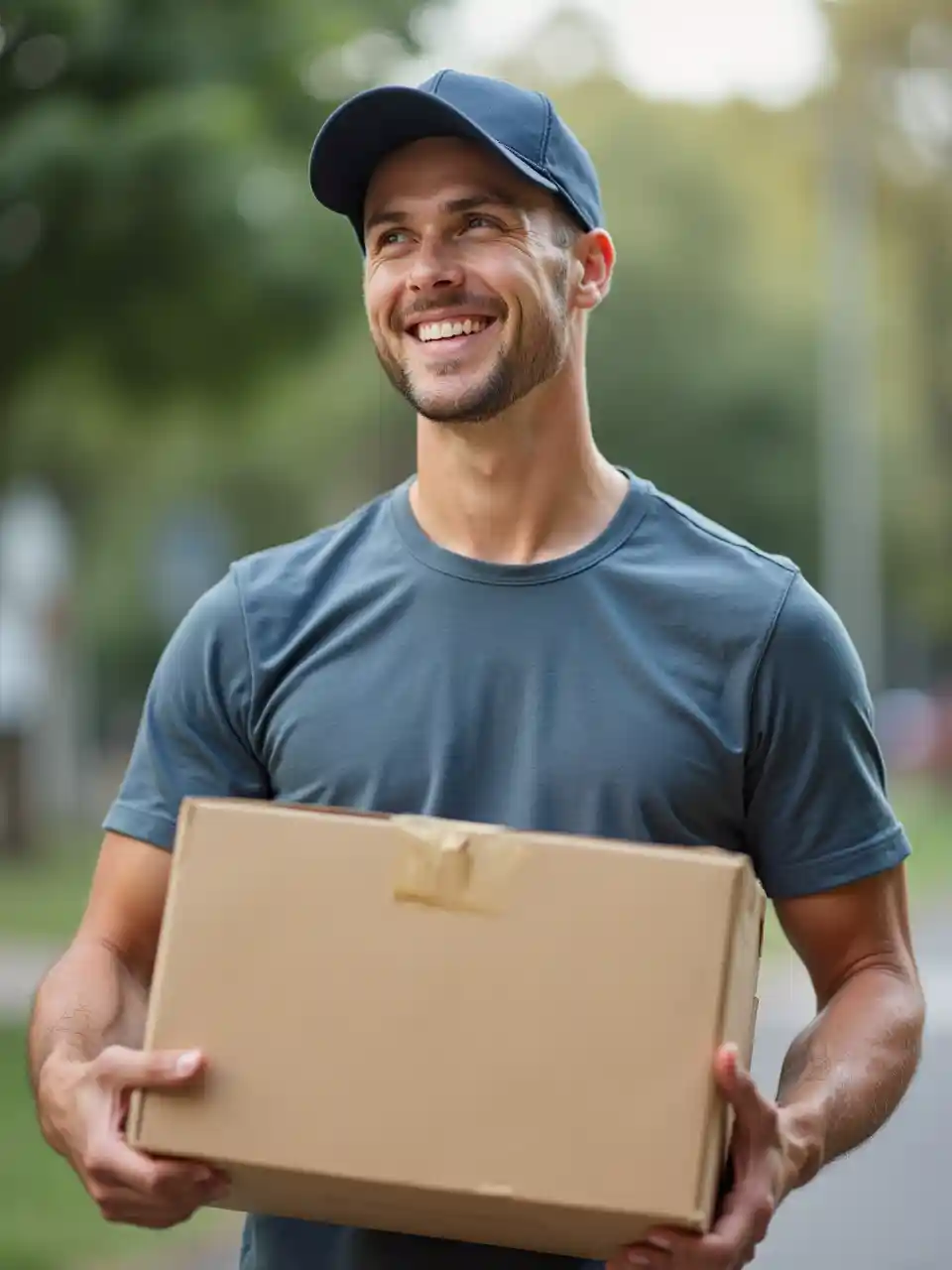 Portrait d'un livreur, casquette et t-shirt, carton à la main